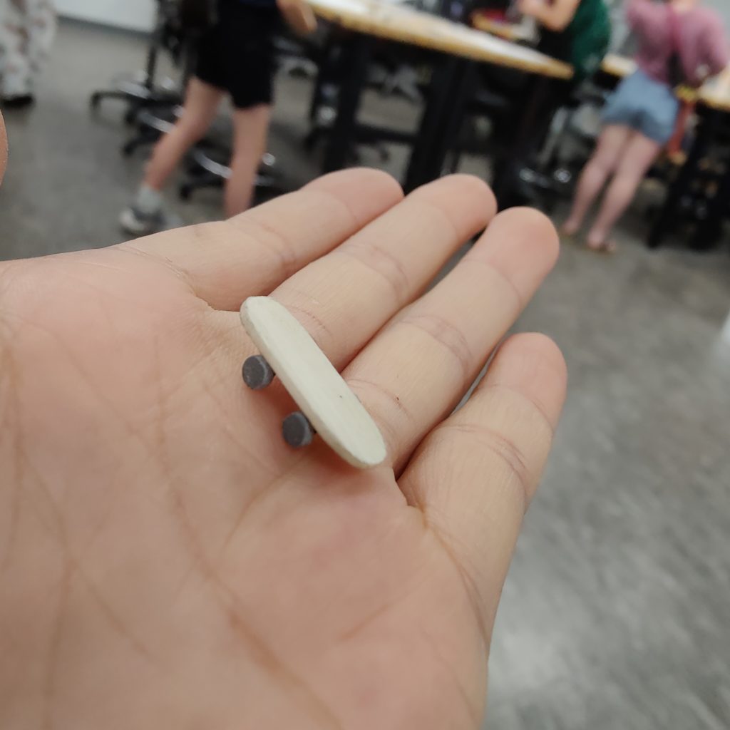 To create the skateboard wheel, I employed pro poxy to sculpt its shape. I then connected the pieces with small wires and finally used 1/16 wire to bend out the shape that allowed the wheel to rotate freely, ensuring it would function properly when in use.